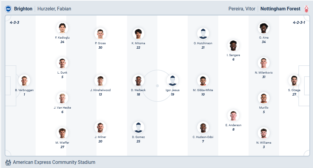 Brighton đã chấm dứt chuỗi trận không thắng của mình bằng 3 điểm trước Brentford ở vòng đấu trước, chiến thắng quan trọng giúp chiếc ghế của HLV Fabian Hürzeler vững chắc hơn nhưng vị trí thứ 14 hiện tại vẫn là sự tụt lùi so với mùa giải trước. Chính vì vậy các cầu thủ Brighton cần tiếp tục có kết quả tốt ở vòng đấu thứ 28 này, họ đặt mục tiêu giành chiến thắng. Đối thủ Nottingham không có phong độ cao là cơ hội tốt để Brighton có thêm 3 điểm nữa và nhiều khả năng đội bóng chủ nhà sẽ có được điều mình cần.